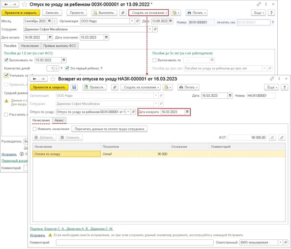 Этот документ удобнее вводить на основании документа отпуска по уходу за ребенком по кнопке Создать на основании. С указанной даты возврата будут возобновлены ранее действовавшие плановые начисления сотрудника. При необходимости их можно изменить в этом документе.