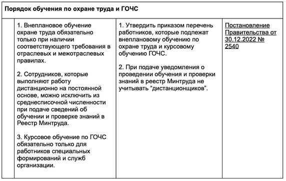 Некоторые изменения наступят и в порядке обучения работников охране труда и курсовом обучении по ГОЧС (постановление Правительства от 30.12.2022 № 2540 вносит поправки в п. 61 и приложение № 4 постановления № 2464).