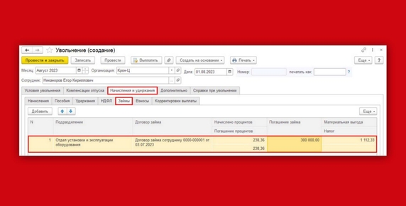 Если сотрудник, которому был выдан займ, увольняется из организации, то при регистрации документа «Увольнение» на закладках «Начисления и удержания – Займы» автоматически заполнится строка с суммой погашения займа