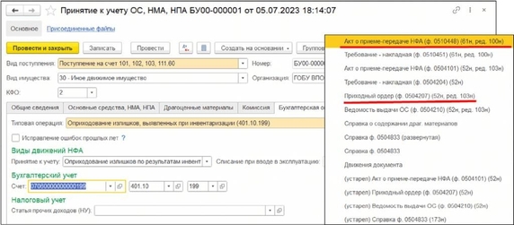 Из документов можно сформировать печатную форму Приходный ордер (ф. 0504207), а также Акт о приеме-передаче (ф. 0510448) и/или электронный документ Акт о приеме-передаче (ф. 0510448), подписав его необходимыми электронными подписями.