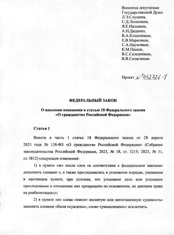 В Госдуму внесён законопроект, согласно которому отказывать в приеме в российское гражданство будут не только людям, в отношении которых идет уголовное преследование, но и тем, в отношении кого оно было прекращено по нереабилитирующим основаниям (сроки давности, примирение сторон, назначение судебного штрафа и т. д.).