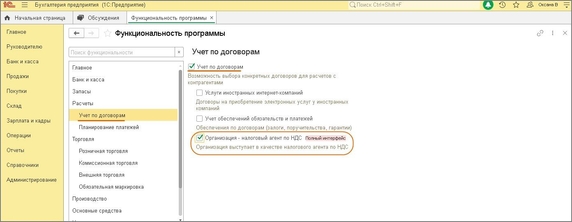 Проверьте, что на закладке "Расчеты" в блоке "Учет по договорам" установлены флажки "Учет по договорам" и "Организация - налоговый агент по НДС".