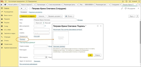 Для настройки факсимиле других сотрудников, кроме руководителя и главного бухгалтера, откройте справочник "Сотрудники" (раздел: Зарплата и кадры - Сотрудники), выберите сотрудника и перейдите по ссылке "Подпись". Загрузите предварительно подготовленный отдельный файл с изображением подписи в формате PNG (см. картинку).