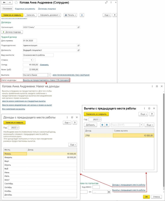 Ввод данных о доходах и вычетах сотрудников с предыдущего места работы осуществляется в формах «Доходы с предыдущего места работы» и «Вычеты с предыдущего места работы».