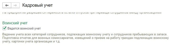 Чтобы сформировать указанный отчет, изначально необходимо выполнить ряд настроек. Для этого перейдите в раздел «Настройка» - «Кадровый учет». В открывшемся окне установите флажок на «Ведется воинский учет».