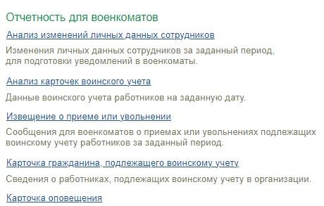 По итогу установки флага в кадровых отчетах появятся отчеты для военкоматов, в том числе Извещение о приеме или увольнении (Раздел «Кадры» – Журнал «Кадровые отчеты»).