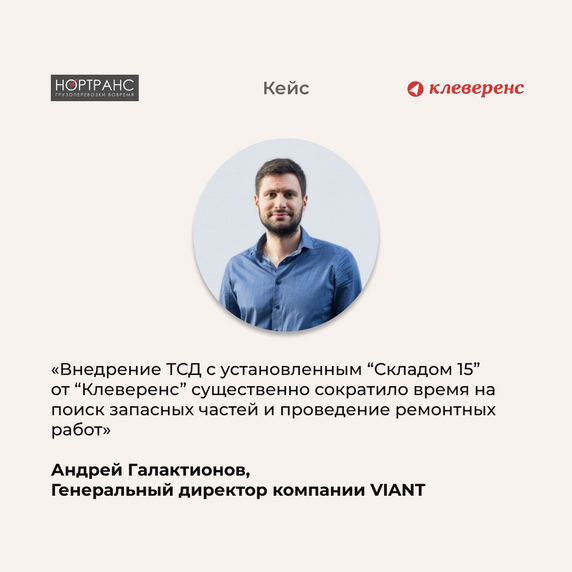 Внедрение ТСД с установленным «Складом 15» от «Клеверенс» существенно сократило время на поиск запасных частей и проведение ремонтных работ. Все складские операции сейчас выполняются сотрудниками «НОРТРАНСА» с помощью мобильных устройств. Адресный склад позволяет кладовщикам управлять местами хранения деталей, изменяя ячейку в режиме Online с ТСД. Мы успешно ввели систему в промышленную эксплуатацию.Андрей Галактионов, Генеральный директор компании VIANT