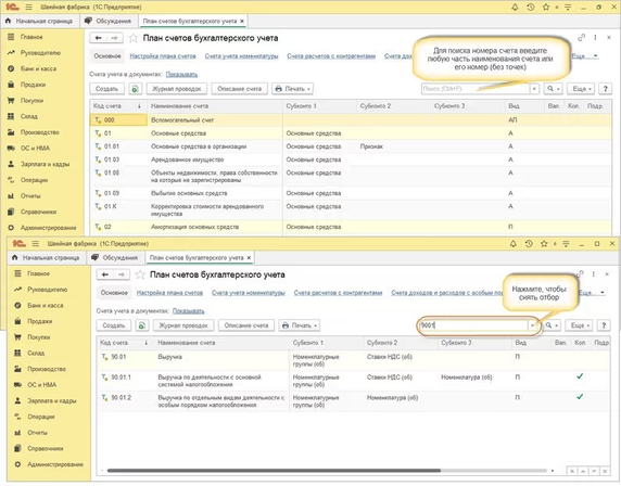 В списке "План счетов бухгалтерского учета" в поле "Поиск" введите любую часть наименования счета или его номер (без точек), например, 9001 (см. картинку).