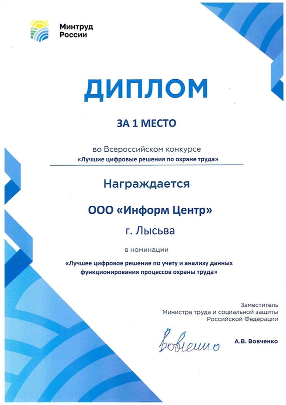 Диплом за 1 место во всероссийском конкурсе «Лучшие цифровые решения по охране труда» в номинации «Лучшее цифровое решение по учету и анализу данных функционирования процессов охраны труда» был вручен нашему руководителю, Просвирнину Дмитрию 27 сентября.
