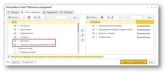 После всех проделанных действий на вкладке поля и сортировки мы увидим следующее поле для отображения – Должность. Трудовая функция. Код по ОКЗ. Лишние поля можно убрать, сняв флаг напротив, но важно, чтобы оставался флаг у поля Должность, параллельно с полем Должность. Трудовая функция. Код по ОКЗ, чтобы отражение было корректным.