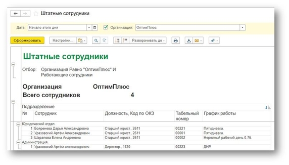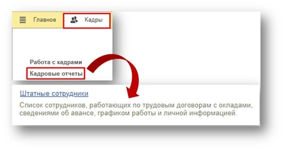 Отчёт «Штатные сотрудники» находится в разделе Кадры – Кадровые отчёты.