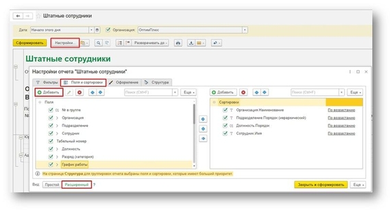 В данном отчёте для изменения общих настройки формирования необходимо перейти по кнопке Настройки – Вид расширенный – вкладка Поля и сортировки.