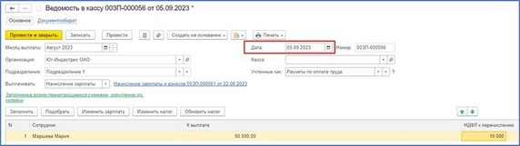 1) в строки 110-142 попадают суммы из документов начислений (например, Начисление за первую половину месяца, Начисление зарплаты и взносов, Премии, Разовые начисления, Отпуска, Больничные и т.п.) по планируемой дате выплаты, которая указывается внизу этих документов – если эта дата «входит» в отчетный период, то, следовательно, суммы дохода и НДФЛ будут попадать в отчет 6-НДФЛ. Например, если зарплата августа выплачена в сентябре (планируемая дата выплаты в документе Начисление зарплаты и взносов указана сентябрьская), то суммы дохода и исчисленные суммы налога будут попадать в Раздел 2 отчета 6-НДФЛ, сформированного за 9 месяцев 2023г. А вот сентябрьская зарплата, выплаченная в октябре, в отчет за 9 месяцев уже не попадет, потому что дата выплаты приходится на октябрь – следующий отчетный период.
