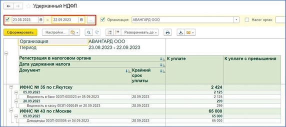 - Для анализа Раздела 1 отчета 6-НДФЛ рекомендуется использовать аналитический отчет Удержанный НДФЛ. Он находится в разделе Налоги и взносы – Отчеты по налогам и взносам. Формировать его необходимо в разрезе конкретного срока перечисления налога, а не по календарному месяцу: