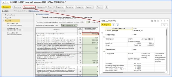 - Используйте кнопку «Расшифровать» в 6-НДФЛ. Обратите внимание, что при ручной корректировке отчета расшифровка будет все равно содержать первоначальные данные – в этом случае в расшифровке будет приписка, что данные расшифровки отличаются от данных в отчете.