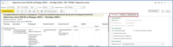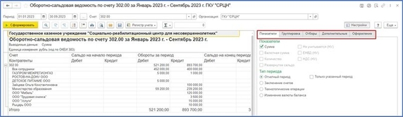 Блок настроек в аналитических отчетах находится справа и состоит из нескольких вкладок. Например, в оборотно-сальдовой ведомости по счету набор настроек следующий: