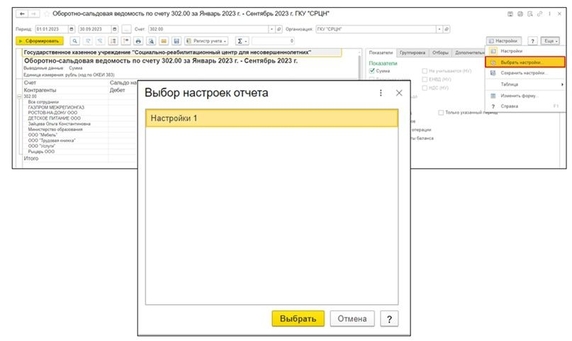 Выбрать сохраненные настройки и сформировать по ним отчет можно по кнопке Еще – Выбрать настройки: