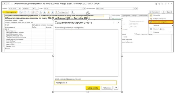 Также выставленные настройки можно сохранить, чтобы при следующем формировании отчета не выставлять их снова. Для этого нужно перейти по кнопке Еще – Сохранить настройки: