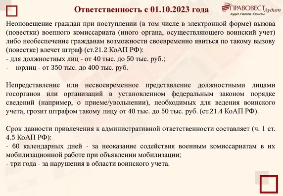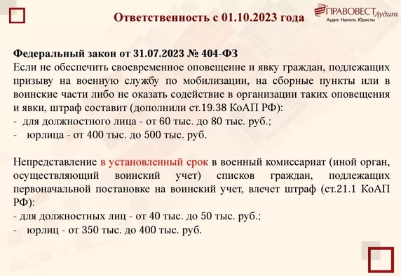 Полагаем, что перечисленное будет актуально и в 2024 году. Кроме того, ожидаем, что в дополнении к этому внимание контролирующих органов будет «приковано» к ведению воинского учета. Это обусловлено увеличением с 1 октября 2023 штрафов за нарушения в этой сфере до 500 тыс. руб.