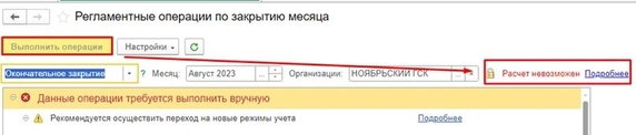 В рабочем месте закрытия месяца кнопка «Выполнить операции» просто не активна и красным подсвечивается ошибка «Расчет не возможен» или «Существуют невыполненные операции».