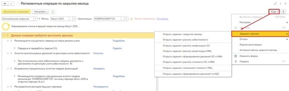 Если открыть период нет возможности, во избежание изменения данных, тогда нужно в рабочем месте «Закрытия месяца» по кнопке «Еще» открыть «Задания к расчету».