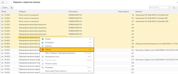 Далее нужно "провалиться" в каждое задание и удалить операции, касающиеся предыдущих периодов, на которые ссылается программа при закрытии месяца. Можно выделить сразу все лишние мероприятия, нажав и удерживая нажатой клавишу SHIFT или CTRL. После этого кнопка «Выполнить операции» становится активной, можно продолжать закрытие текущего месяца. Перед данными действиями рекомендуется в обязательном порядке сделать копию базы.