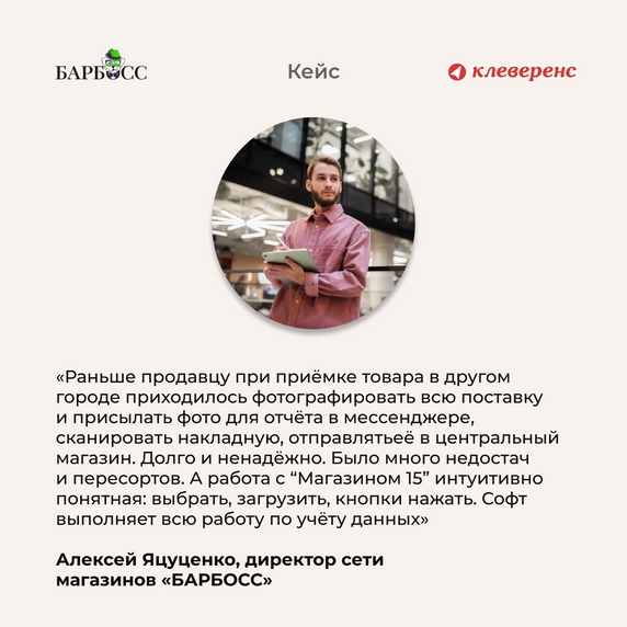 Мы с компанией «ПОРТ» работаем по 1С. Озвучили, что нам нужно: чтоб в Норильске посчитали товар, а результат пересчёта видели в 1С в Красноярске. Они и предложили «Клеверенс». Взяли «Магазин 15» (Базовый).Алексей Яцуценко, Директор сети магазинов «БАРБОСС»