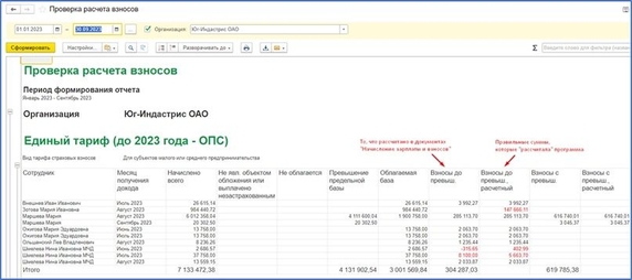 Этот отчет максимально удобен для анализа, так как в случае ошибок в расчете они будут подсвечены красным цветом. Отчет формируется по месяцу получения дохода. В графе «Взносы до превыш.» (взносы до превышения) отображаются суммы, рассчитанные в документах «Начисление зарплаты и взносов», сформированных пользователем. А в графе «Взносы до превыш. расчетный» – суммы, «рассчитанные» самой программой, то есть это правильные суммы, которые должны быть.