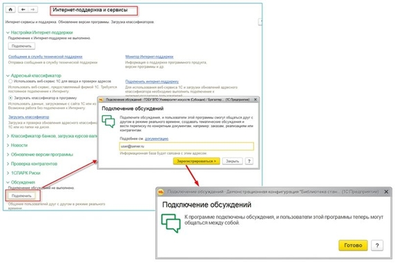 Для подключения обсуждений следует использовать кнопку «Подключить» в группе «Обсуждения» формы «Интернет-поддержка и сервисы» раздела «Администрирование».