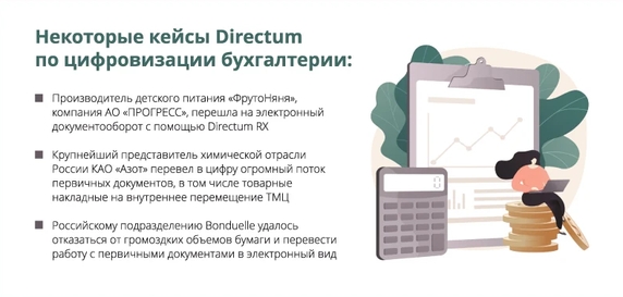 — Мы знаем, с какими проблемами сталкиваются бухгалтеры сегодня. Специально для этого создана экосистема Directum, в которую входят современные инструменты и сервисы для цифровизации задач бухгалтерии. У нас есть различные решения, которые упрощают работу с финансовыми документами в электронном виде. В результате задачи выполняются быстрее и с большей эффективностью.
