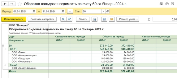 Если взять два предыдущих примера и посчитать общее сальдо на конец периода по счету 60, то мы получим 40 000 руб. по дебету (задолженность перед нашими поставщикам ООО «База» и ООО «Продторг»).