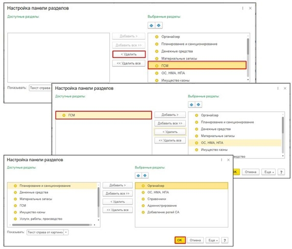 Чтобы наоборот добавить разделы, необходимо в окне настройки панели разделов выбрать нужные разделы в левой части таблицы, после нажатия на кнопку «Добавить» они появятся в правой части.