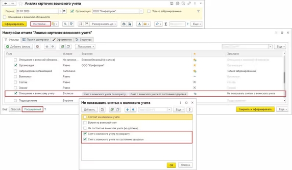 - в колонке "Значение" откройте специальную форму "Не показывать снятых с воинского учета" и установите флажки "Снят с воинского учета по возрасту" и "Снят с воинского учета по состоянию здоровья", кнопка "Ок" (см. картинку)