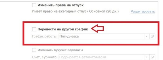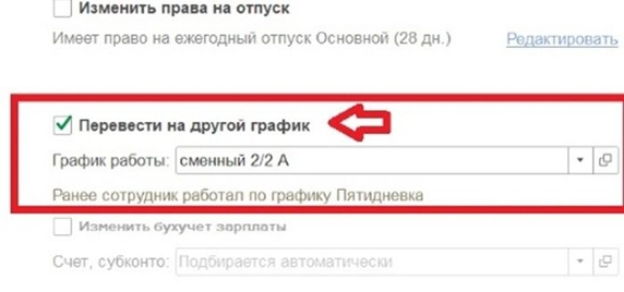 В документе «Кадровый перевод» на вкладке «Главное» необходимо установить флажок в пункте «Перевести на другой график», после чего станет доступно редактирование графика сотрудника. После осуществления выбора нужного графика сотрудника, документ можно провести и закрыть.
