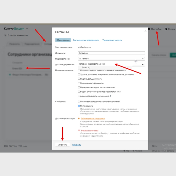 Вариант 1: После получения ответа перейдите в личный кабинет Диадок - выберите "Настройки" - "Сотрудники" - откройте карточку сотрудника Entera EDI - в разделе Подразделение поменяйте на Головное подразделение.