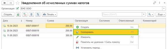 Создать уведомление можно путём копирования предыдущего, если все реквизиты в прошлом документе были проставлены верно. Скопировать документ можно из общего списка уведомлений, нажав на уведомление правкой кнопкой мыши и выбрав пункт Скопировать.