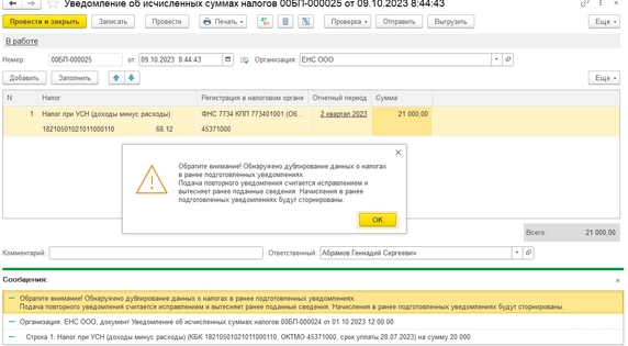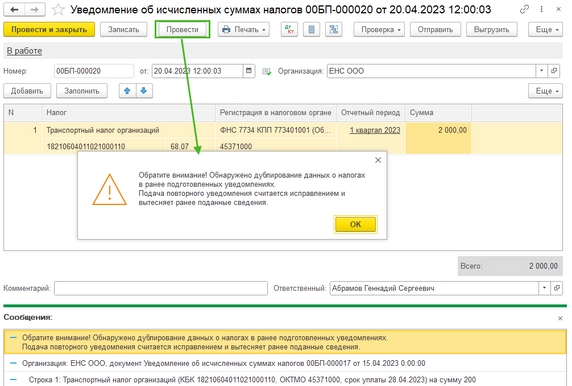 При проведении нового документа 1С покажет предупреждение об обнаружении дубля и вытеснении ранее поданных сведений новыми на стороне ФНС.