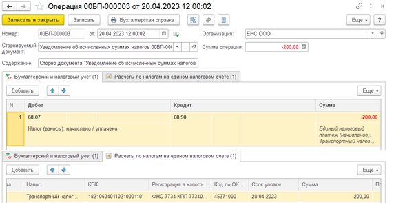 Сторнировать предыдущее уведомление с ошибочной суммой больше не требуется — задолженность по счёту 68.90 и движения по регистрам ЕНС корректируются автоматически при создании нового уведомления с правильной суммой.