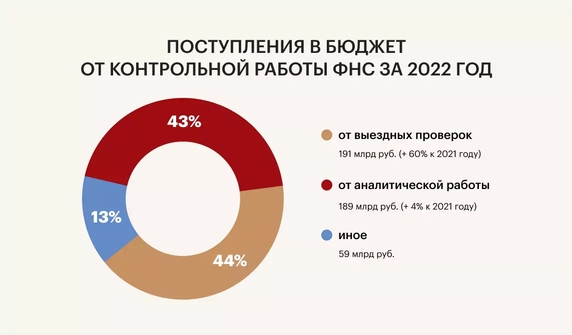 Так, согласно данным ФНС по итогам 2022 года в бюджет поступило 189 млрд руб. по результатам аналитической работы (в т.ч. работы в рамках «комиссий»), что практически равно доначислениям в рамках выездных проверок (191 млрд руб.). Т.е. «внепроверочные» мероприятия налогового контроля пополняют бюджет не хуже выездные проверок.