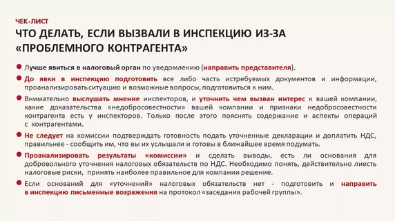 Поэтому, если в полученном уведомлении о вызове на «комиссию» в инспекцию не указаны основание вызова и конкретный вопрос, по которому вызывается руководитель — целесообразно уточнить эти моменты чтобы понимать, о чем будет идти разговор, по какому именно контрагенту есть претензии у налогового органа. Это необходимо, чтобы до визита в налоговый орган оценить положение дел по сделкам с контрагентами, которые заинтересовали налоговый орган (например, есть ли в наличии необходимые документы, подтверждающие право на вычеты по НДС и расходы по сделкам, проявление должной степени осмотрительности при выборе контрагента). Итак, получив уведомление о вызове «на разговор» следует: