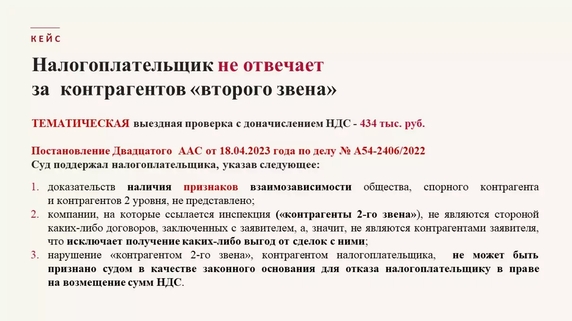 Тем более, что позитивные выводы Верховного Суда РФ по спорам о сомнительных контрагентах дают хорошие шансы отстоять вычеты НДС в такой ситуации (например, Определения Верховного Суда РФ 14.05.2020 No 307-ЭС19-27597 по делу «Звездочка», от 28.05.2020 No 305-ЭС19-16064 по делу «Красцветмет»). В частности, ВС РФ указал, что отказ в праве на вычет НДС возможен лишь при условии, что налогоплательщик-покупатель преследовал цель уклонения от налогообложения в результате согласованных с контрагентами и иными лицами действий либо в отсутствие такой цели он знал или должен был знать о нарушениях налогового законодательства контрагентами (о неуплате ими НДС в бюджет).
