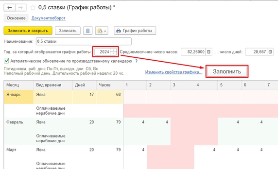 Чтобы обновить график работы, необходимо перейти в раздел Настройка – Графики работы сотрудников. Далее нужно войти в каждый график, выбрать в них 2024 год и нажать кнопку «Заполнить»: