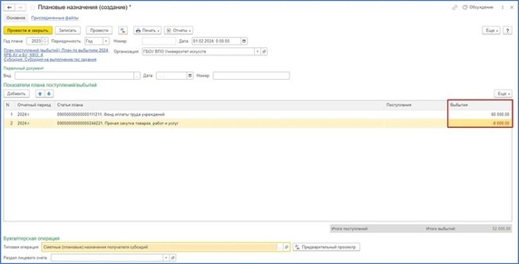 Чтобы скорректировать суммы плановых выбытий, необходимо так же создать документ Плановые назначения, выбрать в нем нужный план по расходам и в графе «Выбытия» указать суммы изменений: аналогично, если суммы расходов увеличились, то суммы вписать положительные, а если суммы расходов сократились, то отрицательные.