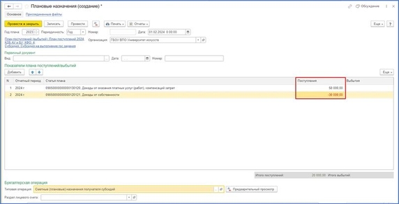 Плановые показатели по доходам и расходам бюджетного или учреждения в течение года могут меняться. Чтобы скорректировать суммы плановых поступлений, необходимо создать документ Плановые назначения, выбрать в нем нужный план по доходам, и в графе «Поступления» указать суммы изменений: если плановые доходы увеличились, то суммы будут положительные, а если суммы доходов уменьшились, то отрицательные.