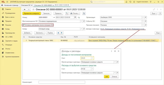 Если при выбытии ОС были извлечены материальные ценности, установите флажок "Остались материалы после списания ОС".