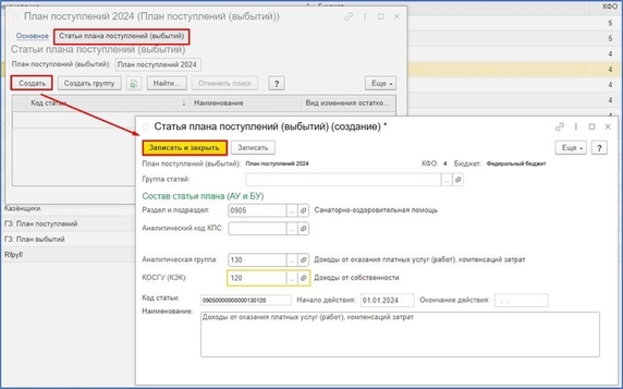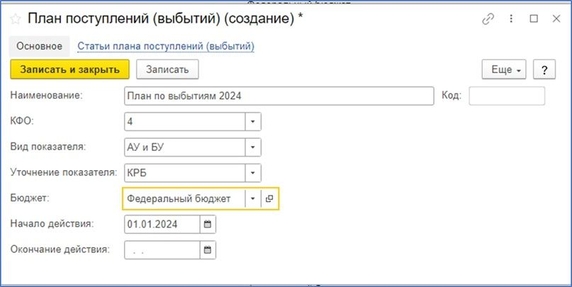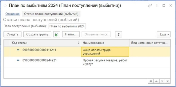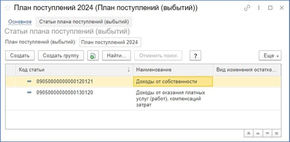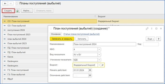 Далее нужно заполнить статьи Плана поступлений (выбытий). Для этого можно в самом Плане поступлений (выбытий) перейти по ссылке «Статьи плана поступлений (выбытий)» в верхней части и по кнопке «Создать» заполнить информацию по каждой статье плана. Заполним статьи плана для Плана поступлений: