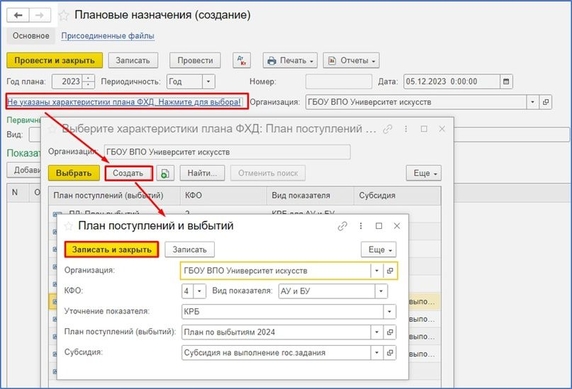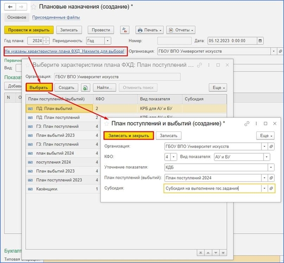 Далее необходимо заполнить справочник «Субсидии» (там вносится наименование субсидии). После этого следует перейти к созданию документа Плановые назначения. Обратите внимание, что необходимо формировать отдельные Плановые назначения по поступлениям и по выбытиям. Так, если мы создаем Плановые назначения по поступлениям, то при выборе характеристик плана ФХД мы выбираем вид показателя «АУ и БУ», уточнение показателя «КДБ» и указываем «План поступлений». Далее – заполняем: