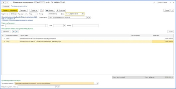После этого документ следует провести и закрыть. Далее нужно сформировать еще один документ Плановые назначения, но уже для выбытий. Заполняется он аналогично, но суммы расходов вносятся в графу «Выбытия»: