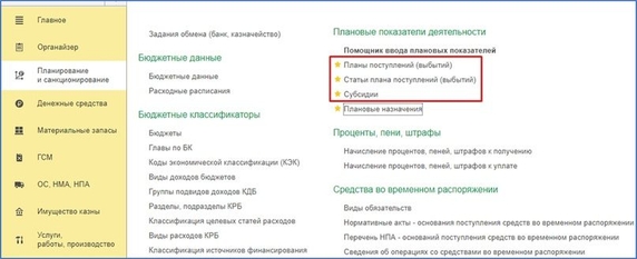 Предварительно в разделе Планирование и санкционирование в блоке Плановые показатели деятельности необходимо заполнить справочники «Планы поступлений (выбытий)», «Статьи плана поступлений (выбытий)» и «Субсидии»: