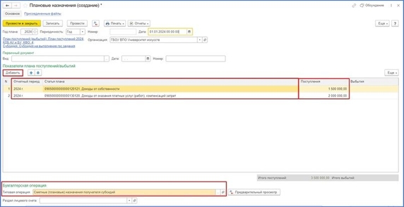 Далее в документе следует заполнить плановый отчетный период, статьи плана и сумму планируемых поступлений по каждой статье. Затем – указать типовую операцию: